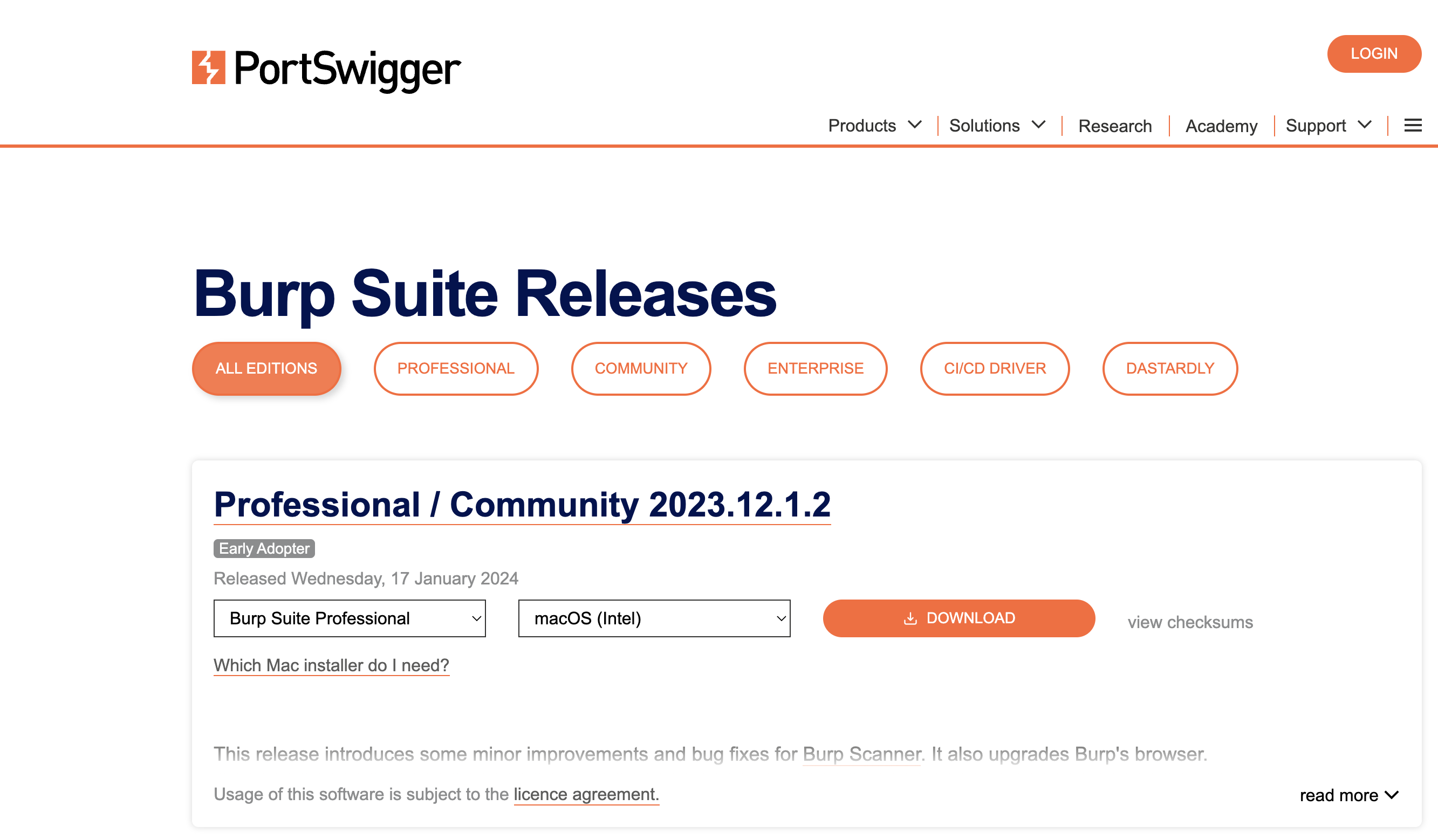历届 BurpSuite版本的官方下载地址:https://portswigger.net/burp/releases