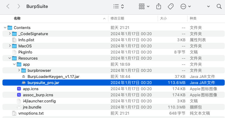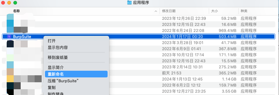 为了美观和避免空格,我直接改了APP名称,全称含有空格,后续的命令和配置都需要注意转义空格(以下需要转义的Burp\ Suite\ Professional.app均已更改为BurpSuite.app)