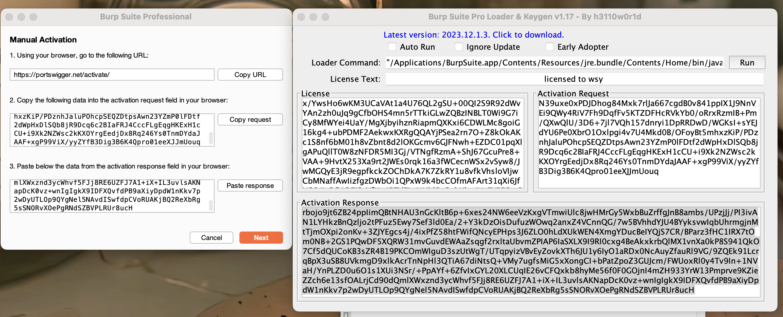 cd /Applications/BurpSuite.app/Contents/Resources/app && "/Applications/BurpSuite.app/Contents/Resources/jre.bundle/Contents/Home/bin/java" "--add-opens=java.desktop/javax.swing=ALL-UNNAMED" "--add-opens=java.base/java.lang=ALL-UNNAMED" "--add-opens=java.base/jdk.internal.org.objectweb.asm=ALL-UNNAMED" "--add-opens=java.base/jdk.internal.org.objectweb.asm.tree=ALL-UNNAMED" "--add-opens=java.base/jdk.internal.org.objectweb.asm.Opcodes=ALL-UNNAMED" "-javaagent:BurpLoaderKeygen_v1.17.jar" "-jar" "/Applications/BurpSuite.app/Contents/Resources/app/burpsuite_pro.jar"