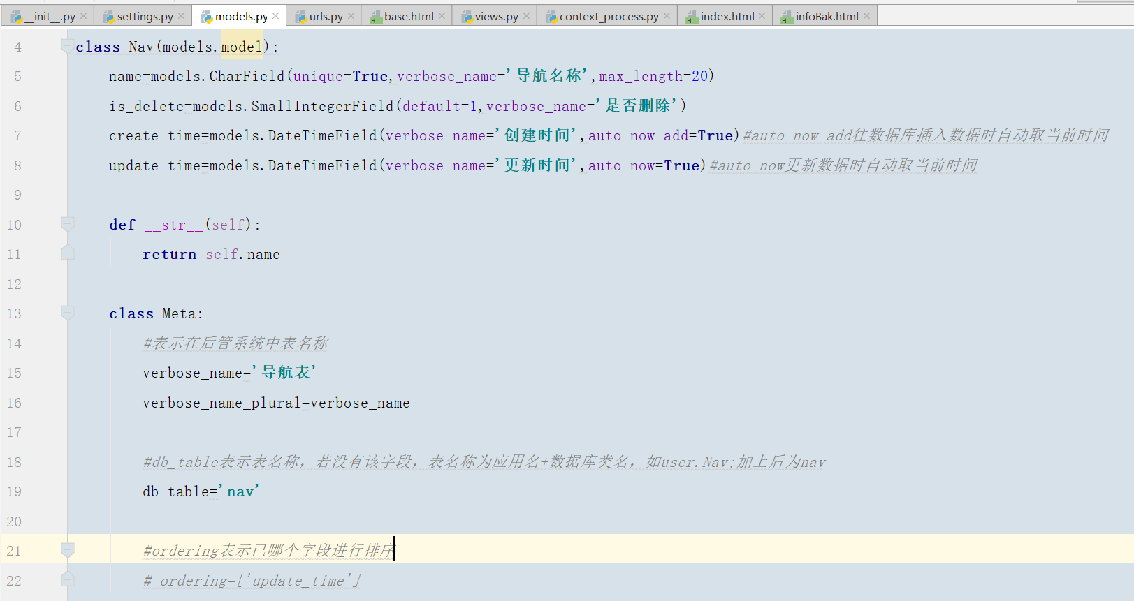 update_time = models.DateTimeField(verbose_name='更新时间', auto_now=True) # auto_now更新数据时自动取当前时间
