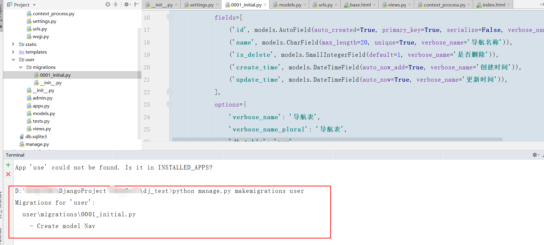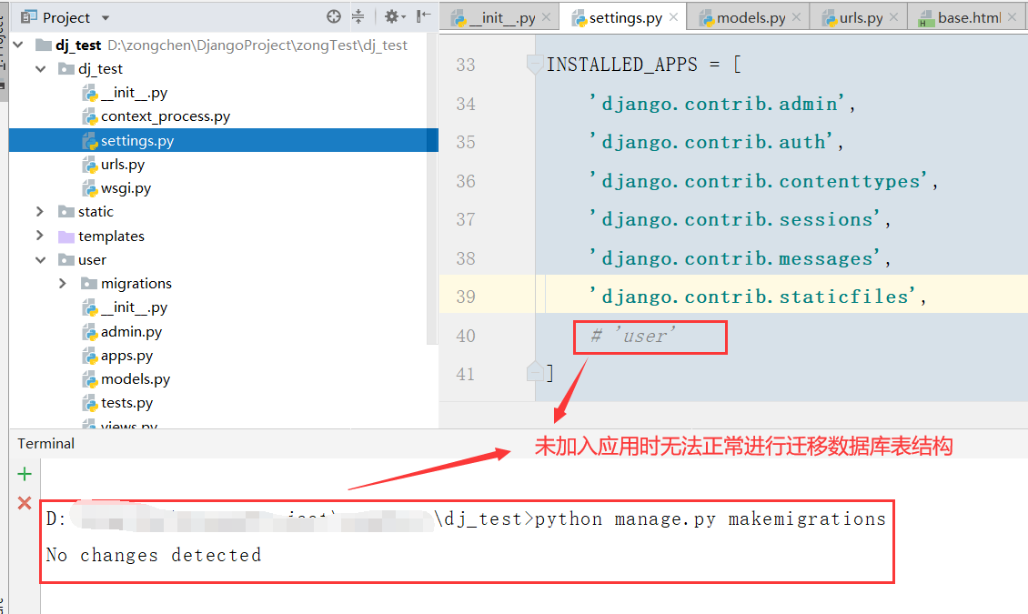 四.同步表结构,同步表结构时需要检查setting配置文件中INSTALLED_APPS是否加入了该数据库的应用,若是没有加入的话通过python manage.py makemigrations时无法正常进行迁移数据库表结构
