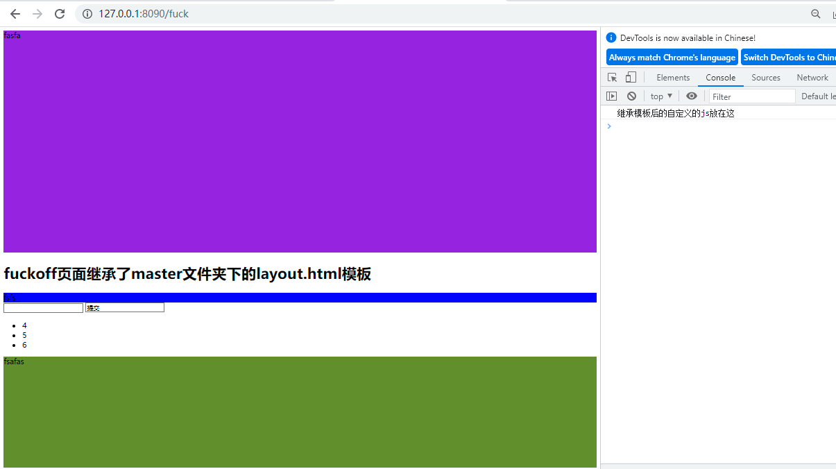 <!DOCTYPE html> <html lang="en"> <head> <meta charset="UTF-8"> <title>Title</title> <style> .header{ height: 480px; background-color: blueviolet; } .footer{ height: 240px; background-color: olivedrab; } /*自定义css样式*/ {% block css %}{%end%} </style> </head> <body> <div class="header">fasfa</div> {% block body %}{%end%} <div class="footer">fsafas</div> <script src=""></script> <!-- 自定义js文件 --> {%block js%}{%end%} </body> </html>