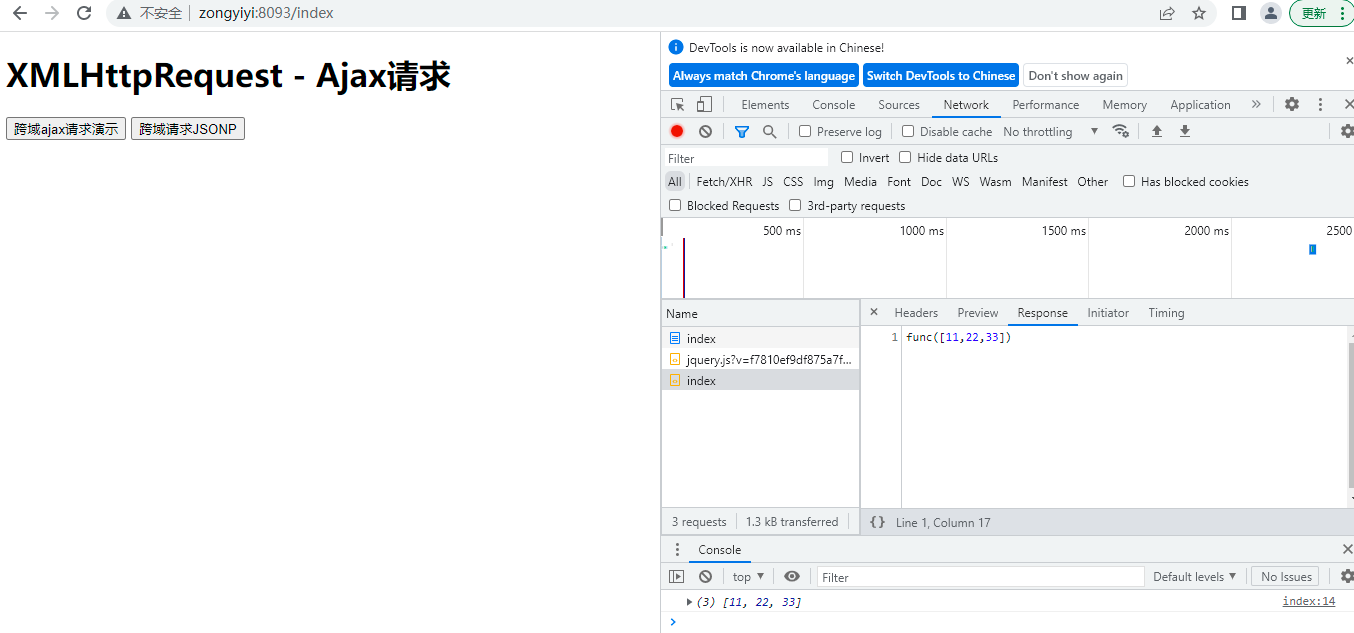 <!DOCTYPE html> <html> <head lang="en"> <meta charset="UTF-8"> <title></title> </head> <body> <h1>XMLHttpRequest - Ajax请求</h1> <input type="button" onclick="doAjax();" value="跨域ajax请求演示" /> <script src="{{static_url('jquery.js')}}"></script> <script type="text/javascript"> function doAjax(){ $.ajax({ url:"http://zongyiyi:8092/index", type:"POST", data:{"k1":"v1"}, success:function (arg){ console.log(arg) } }) } </script> </body> </html>