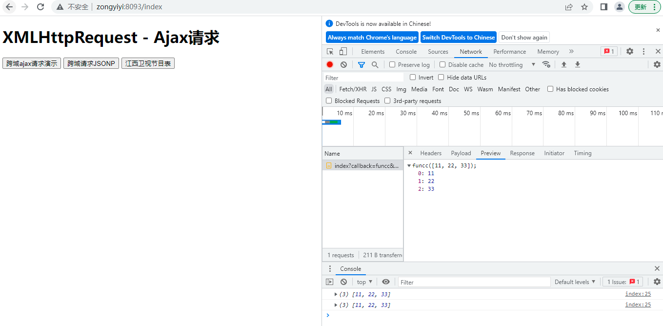 在浏览器中输入http://zongyiyi:8093/index 后点击江西节目表会进行发送跨域请求