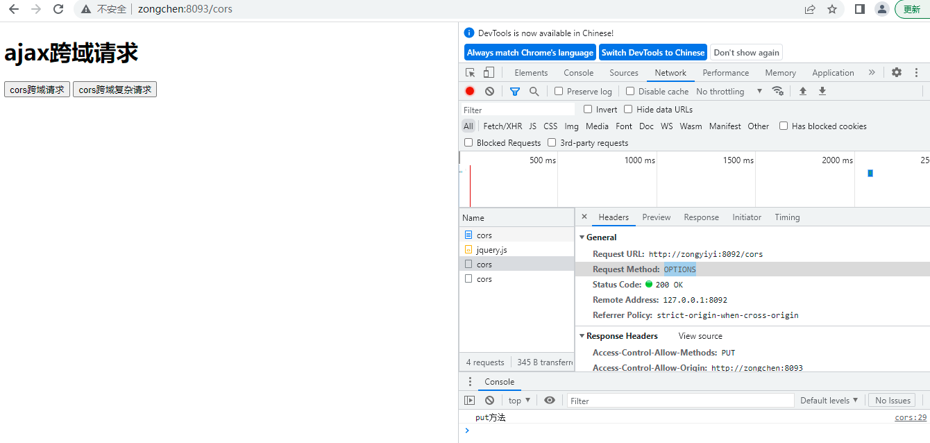 <!DOCTYPE html> <html> <head lang="en"> <meta charset="UTF-8"> <title></title> </head> <body> <h1>ajax跨域请求</h1> <input type="button" onclick="doAjax();" value="cors跨域请求" /> <input type="button" onclick="fuza();" value="cors跨域复杂请求" /> <script src="static/jquery.js"></script> <script type="text/javascript"> function doAjax(){ $.ajax({ url:"http://zongyiyi:8092/cors", type:"POST", data:{"k1":"v1"}, success:function (arg){ console.log(arg) } }) } function fuza(){ $.ajax({ url:"http://zongyiyi:8092/cors", type:"PUT", data:{"k1":"v1"}, success:function (arg){ console.log(arg) } }) } </script> </body> </html>