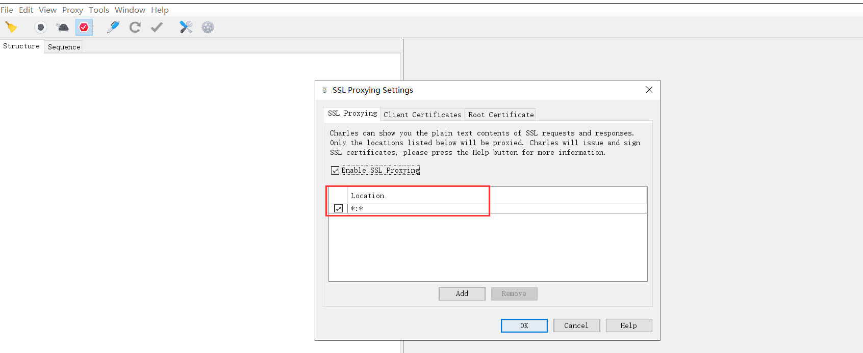 2.在Proxy下的SSL Proxy中进行启用SSL代理,并配置主机地址和端口,*:*