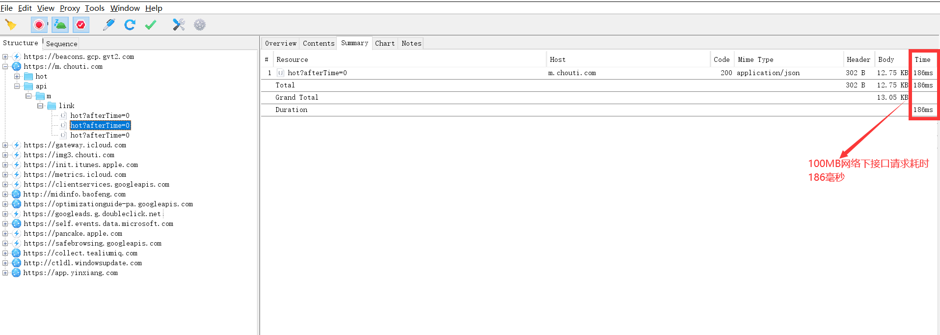 2.进行抓包可以看到不同网络情况下接口请求的耗时是不一样的