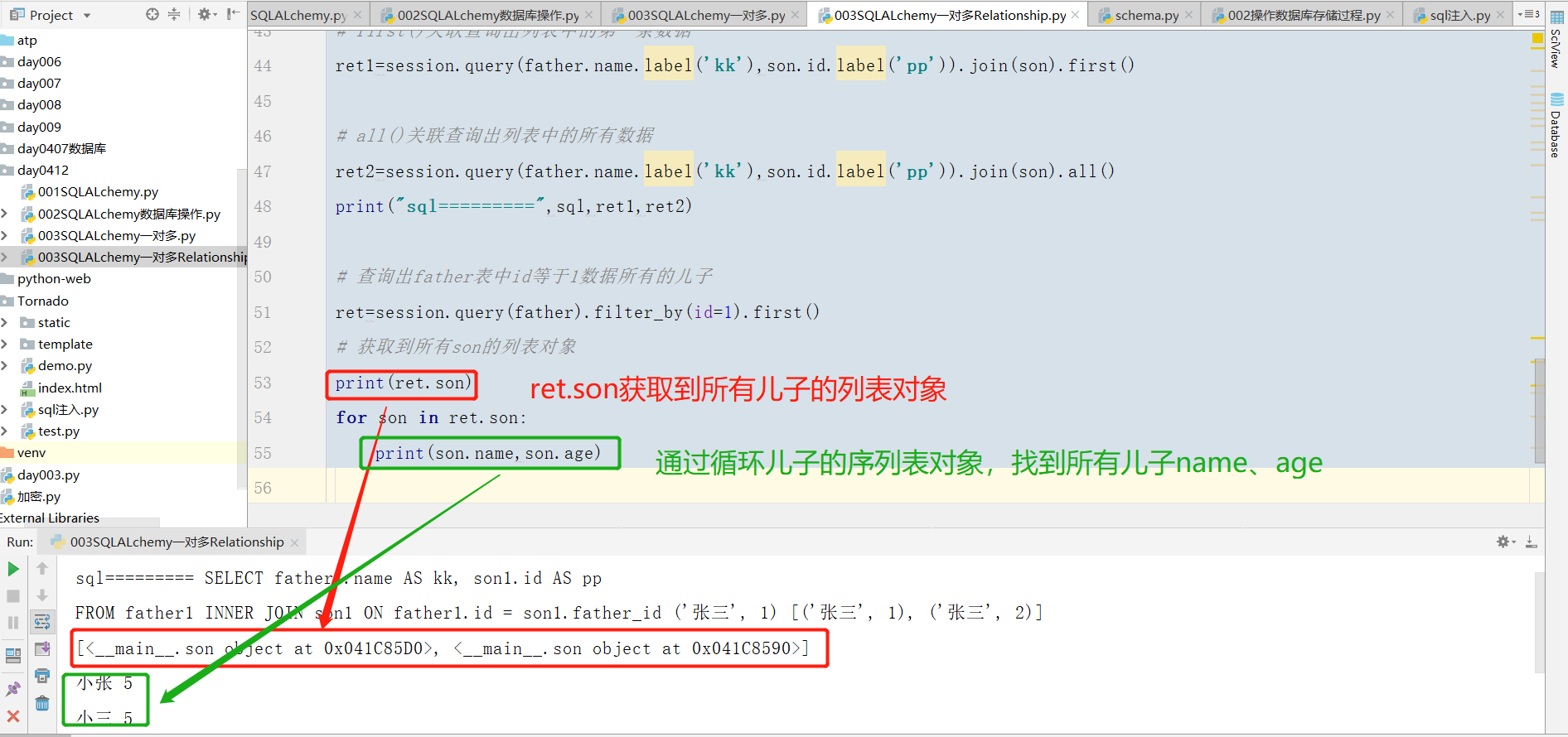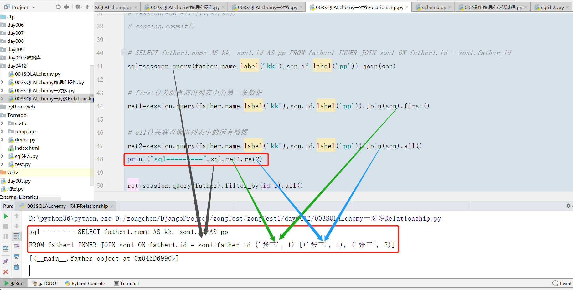 from sqlalchemy.ext.declarative import declarative_base from sqlalchemy import Column, Integer, String, ForeignKey, UniqueConstraint, Index from sqlalchemy.orm import sessionmaker, relationship from sqlalchemy import create_engine engine = create_engine("mysql+pymysql://root:123456@127.0.0.1:3306/db1", max_overflow=5) Base=declarative_base() class son(Base): __tablename__='son1' id=Column(Integer,primary_key=True) name=Column(String(32),index=True) age=Column(Integer) father_id=Column(Integer,ForeignKey('father1.id'),nullable=False) class father(Base): __tablename__='father1' id = Column(Integer, primary_key=True) name = Column(String(32),index=True) age = Column(Integer) son = relationship('son') Base.metadata.create_all(engine) mySession=sessionmaker(bind=engine) session=mySession() # father表添加数据 # f1=Father(name='张三',age=25) # # son表添加数据 # s1=Son(name='小张',age=5) # s2=Son(name='小三',age=5) # # # 添加关联关系 # f1.son=[s1,s2] # session.add_all([f1,s1,s2]) # session.commit() # SELECT father1.name AS kk, son1.id AS pp FROM father1 INNER JOIN son1 ON father1.id = son1.father_id sql=session.query(father.name.label('kk'),son.id.label('pp')).join(son) # first()关联查询出列表中的第一条数据 ret1=session.query(father.name.label('kk'),son.id.label('pp')).join(son).first() # all()关联查询出列表中的所有数据 ret2=session.query(father.name.label('kk'),son.id.label('pp')).join(son).all() print("sql=========",sql,ret1,ret2) ret=session.query(father).filter_by(id=1).all() print(ret)