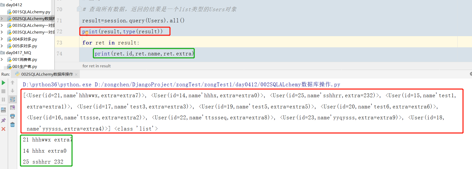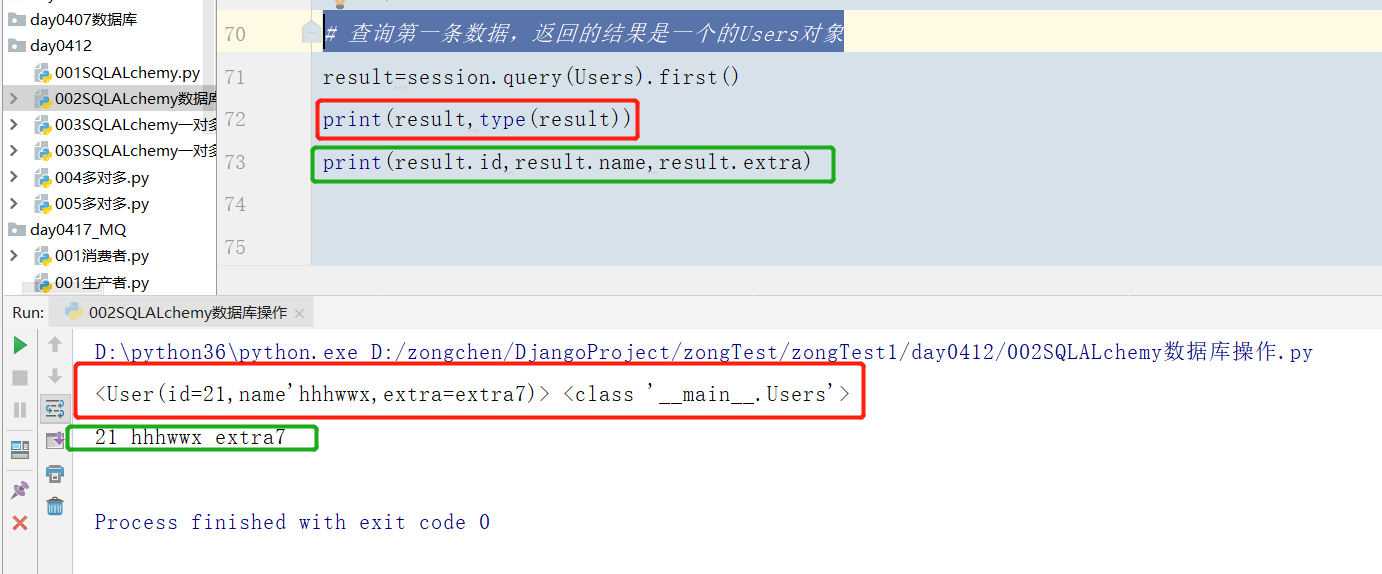 # 4.2查询第一条数据,返回的结果是一个的Users对象 result=session.query(Users).first() print(result,type(result)) print(result.id,result.name,result.extra)