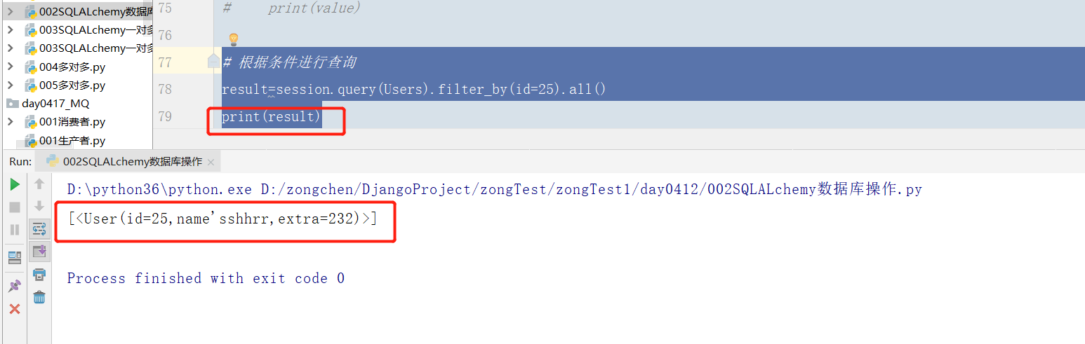 # 4.5根据条件进行查询 result=session.query(Users).filter_by(id=25).all() print(result)