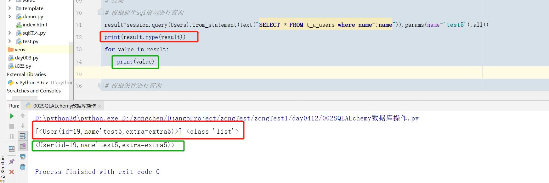 # 4.7根据原生sql语句进行查询 result=session.query(Users).from_statement(text("SELECT * FROM t_u_users where name=:name")).params(name='test5').all() print(result,type(result)) for value in result: print(value)