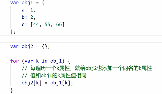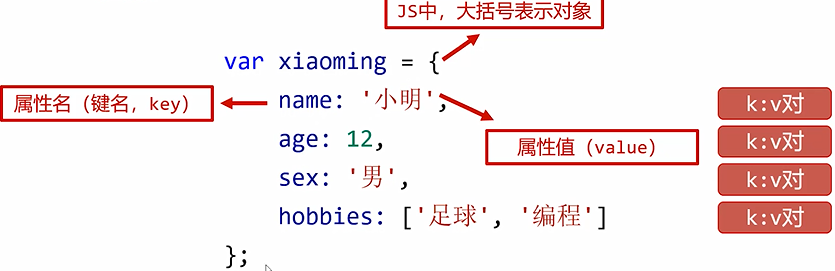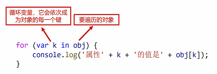 - 和遍历数组类似,对象也可以被遍历,遍历对象需要使用for...in...循环