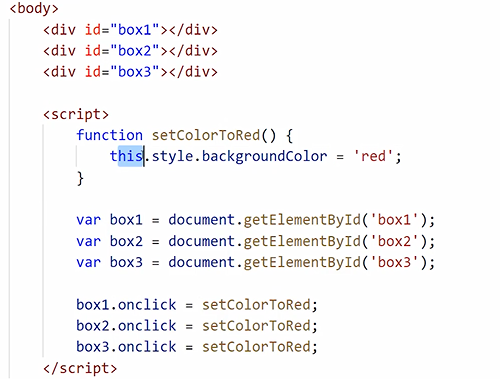 xxx.onclick=function(){}; - 小案例 点击哪个盒子,哪个就变红,要求使用同一个事件处理函数