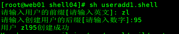 1 #!/usr/bin/bash 2 3 read -p "请输入用户的前缀: " qz 4 if [[ ! $qz =~ ^[a-Z]+$ ]];then 5 echo "你输入的前缀不是英文...." 6 exit 7 fi 8 9 read -p "请输入创建用户的后缀: " hz 10 if [[ ! $hz =~ ^[0-9]+$ ]];then 11 echo "你输入后缀的不是数字" 12 13 else 14 user=${qz}${hz} 15 id $user &>/dev/null 16 if [ $? -eq 0 ];then 17 echo "用户已经存在 $user" 18 else 19 useradd $user 20 echo "用户 $user创建成功" 21 22 fi 23 fi