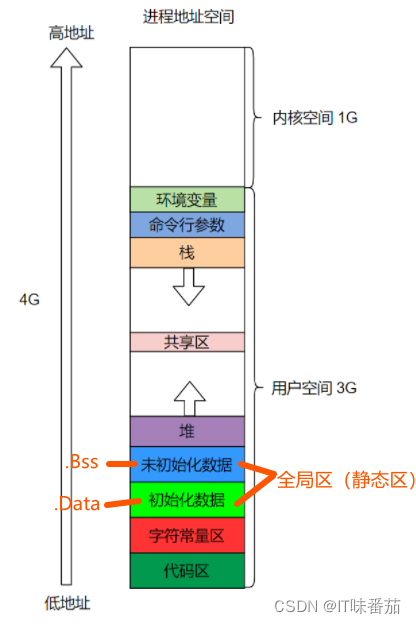 进程的内存虚拟地址分配:用户空间(代码段,数据段、堆、动态库地址、栈),内核空间(虚拟地址进程独享,但是实际指向所有进程共享的物理地址)。