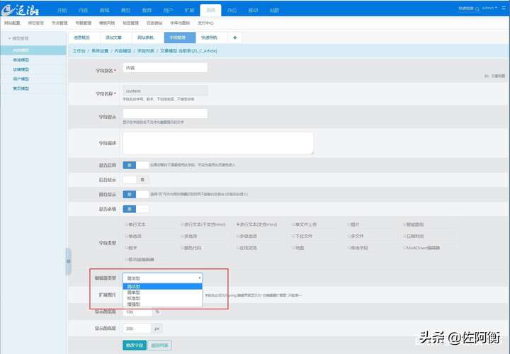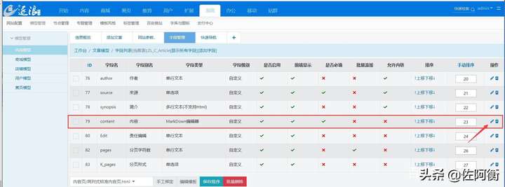 首先选择内容字段后面的编辑,编辑后默认是用的markdown编辑器,可修改字段为多行文办字段。