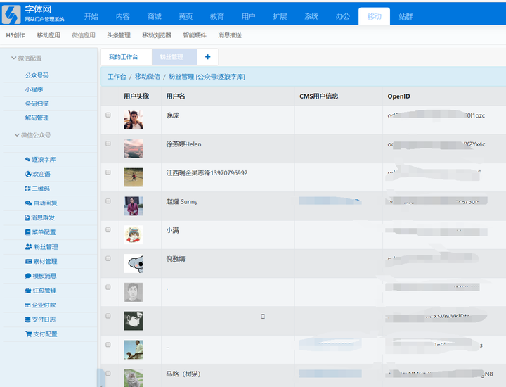 其中粉丝谷管理,可以理解为是关注微信公众号的关注者,这些也都可以在后台管理。如下图可以读取微信相互的相关信息。