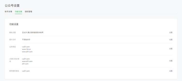 配置好这些信息后,然后进去公众号设置-基本设置,来设置绑定域名