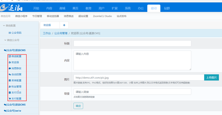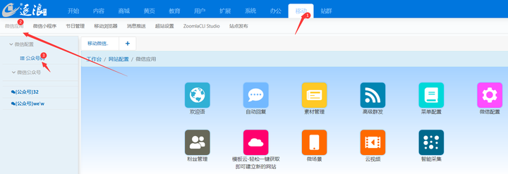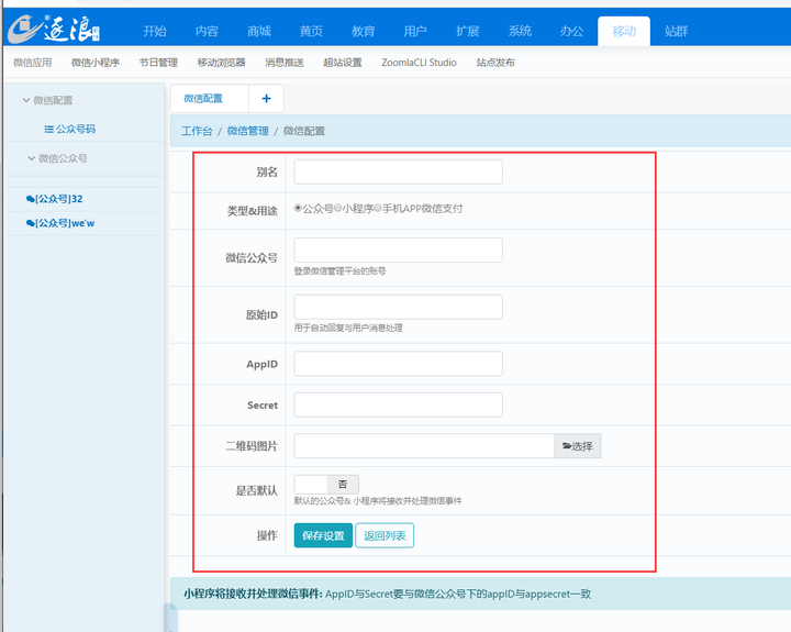 首先进入逐浪CMS后台,选择移动-微信应用,点击公众号码