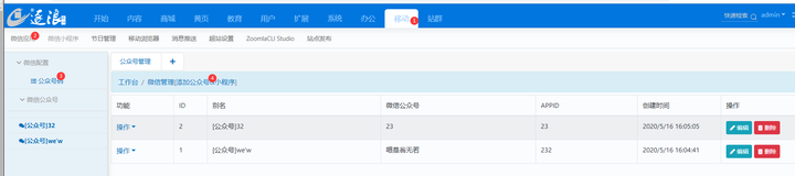 上图是创建好的微信公众号,创建好的微信公众号信息的各项配置都可直接在后台维护了,大大提升了维护效率。
