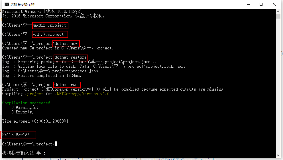打开cmd,依次输入mkdir .project(创建目录),cd .\.project(进入目录),dotnet new(新建初始项目),dotnet restore(还原依赖),dotnet run(运行)即可运行第一个Hello World程序