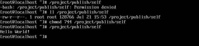修改可执行权限后,即可成功运行“Hello World”,这就是我们“Self-contained applications”方式的部署方法