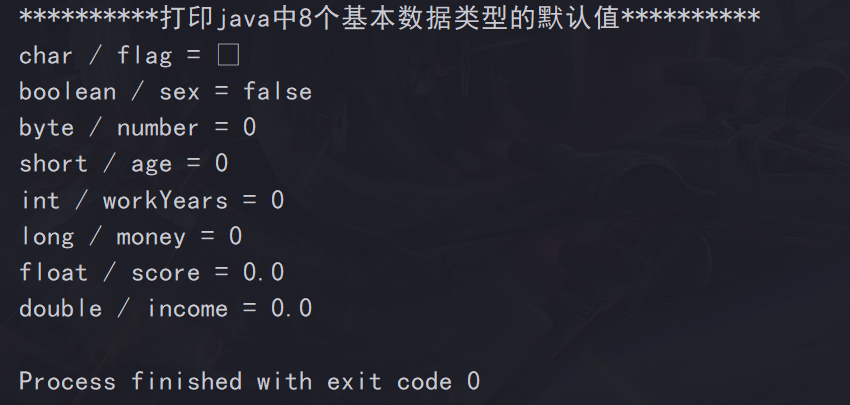 System.out.println("**********打印java中8个基本数据类型的默认值**********");
