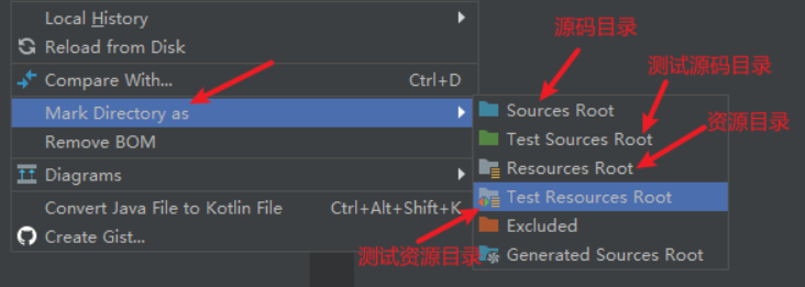 Test resource roots:用于存放测试源码中关联的资源文件。除此之外,和 resource 文件夹没有区别。