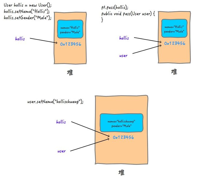 当尝试调用pass方法,并且hollis作为实际参数传递给形式参数user的时候,会把这个地址0x123456交给user,这时,user也指向了这个地址(图2)。