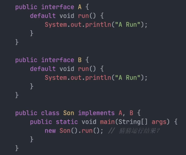 问题来了,如果一个子类实现了多个接口,这些接口中都有相同签名的方法实现,子类调用方法时,会调用哪一个呢? 这就是方法冲突。