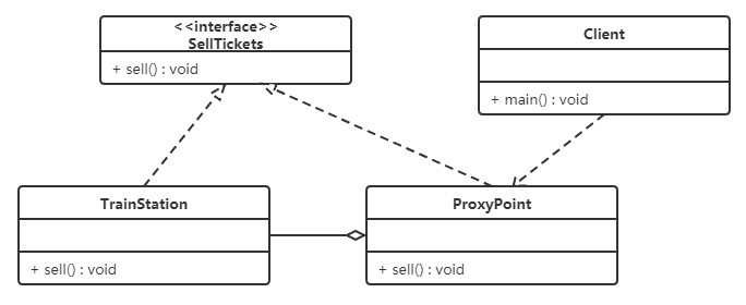 如果要买火车票的话,需要去火车站买票,坐车到火车站,排队等一系列的操作,显然比较麻烦。而火车站在多个地方都有代售点,我们去代售点买票就方便很多了。这个例子其实就是典型的代理模式,火车站是目标对象,代售点是代理对象。类图如下: