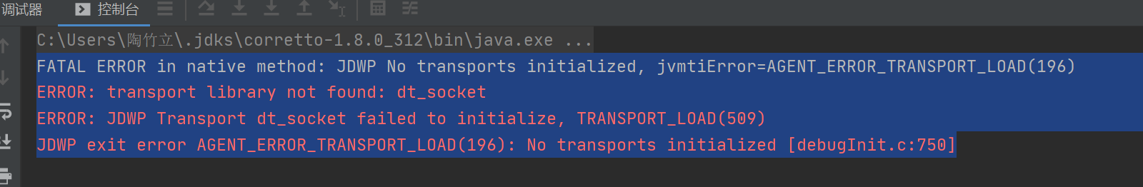 FATAL ERROR in native method: JDWP No transports initialized, jvmtiError=AGENT_ERROR_TRANSPORT_LOAD(196)