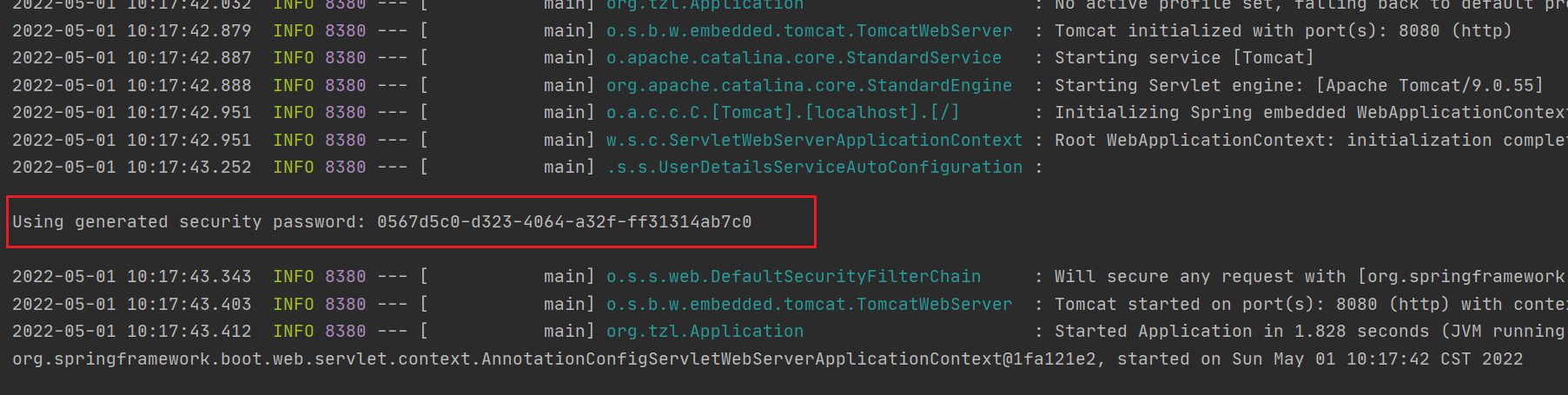 上面提到的跳到了默认登陆页,用户名为:user 密码为:运行时,在控制台输出的一行字符串,通过这个密码,即可登陆;