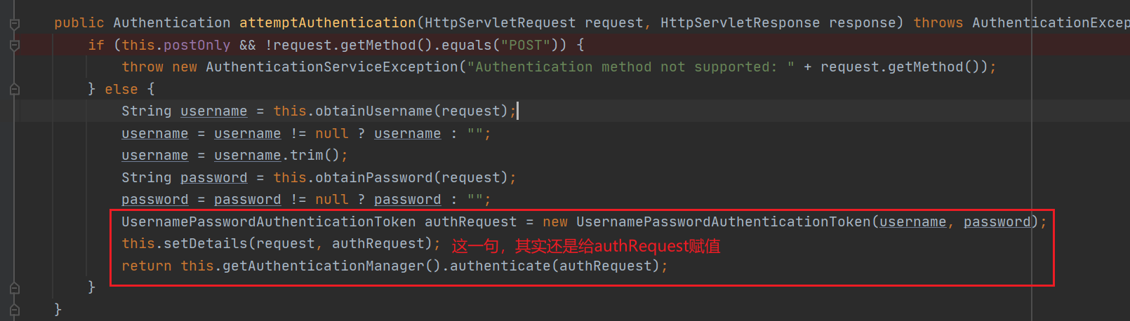 认证UsernamePasswordAuthenticationFilter,通过父类的doFilter开始。调到了本类中的attemptAuthentication方法,即试图去认证;