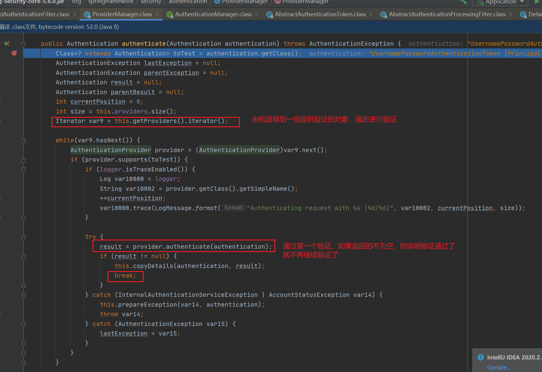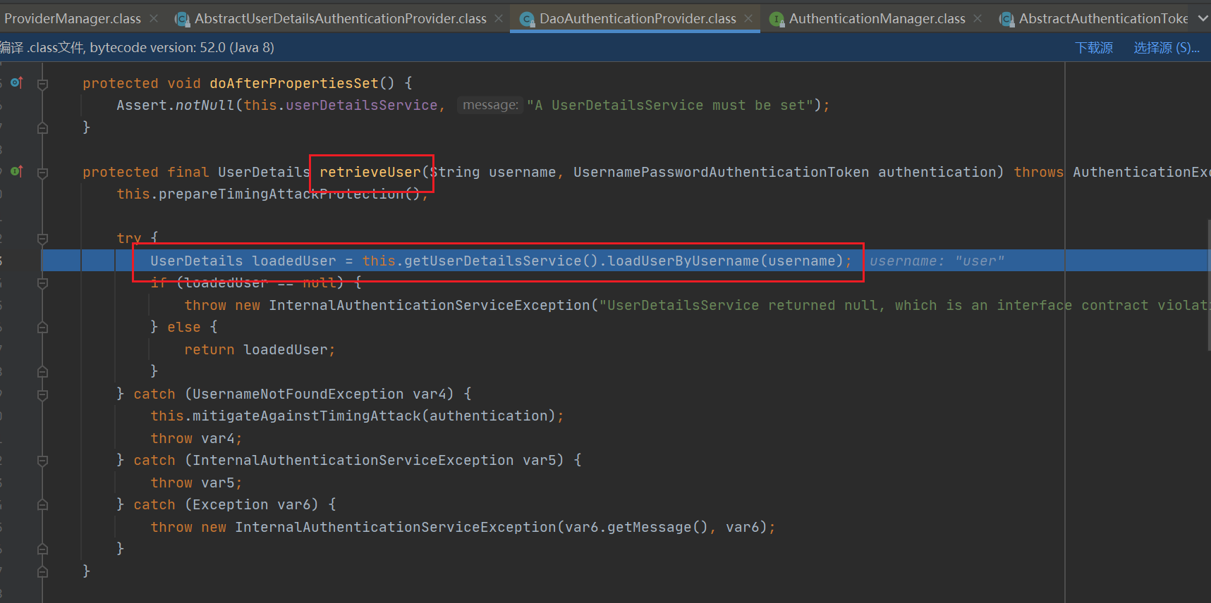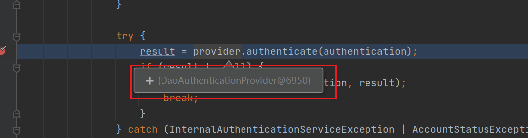 得到用户信息后,就该返回认证提供对象中,对请求用户与库用户进行比如认证了。