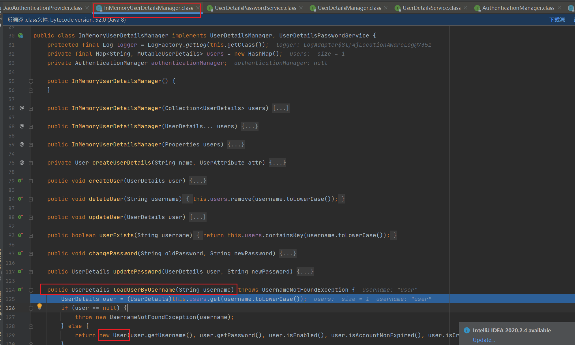 在这个类中,通过接口继承,实现了UserDetailsService接口定义的loadUserByUsername方法,返回的类型是UserDetails。