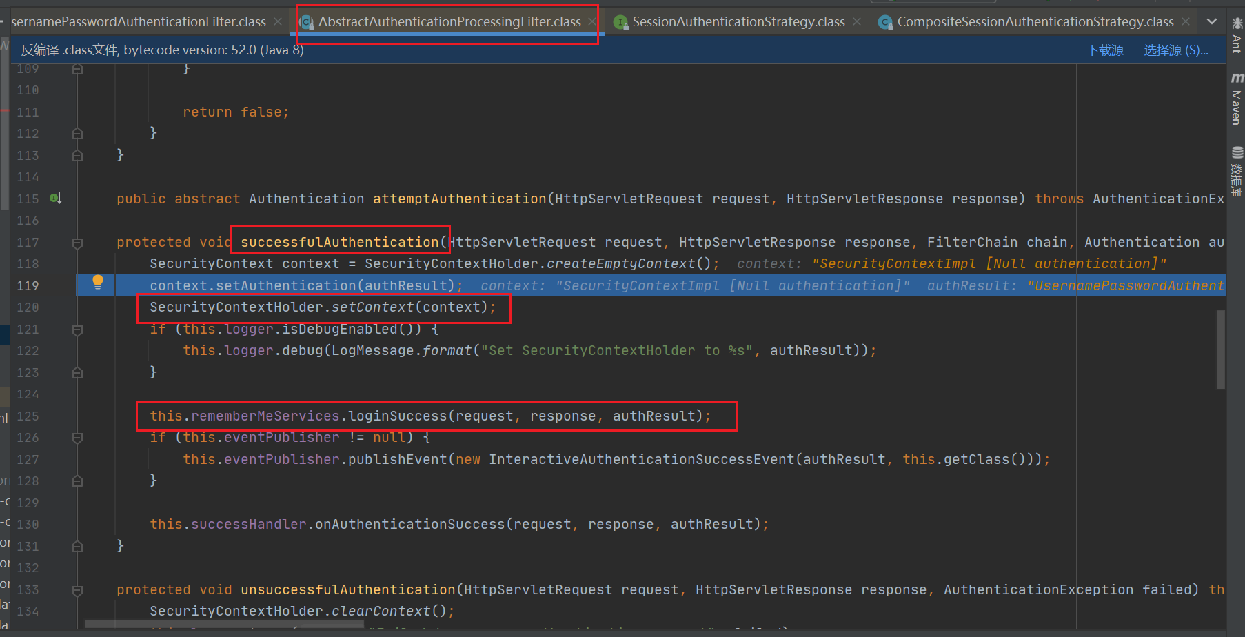 这个在后面很关键。最后就是将认证后的对象,赋给SecurityContextHolder,理解为安全上下文持有对象吧。到目前,验证基本结束。