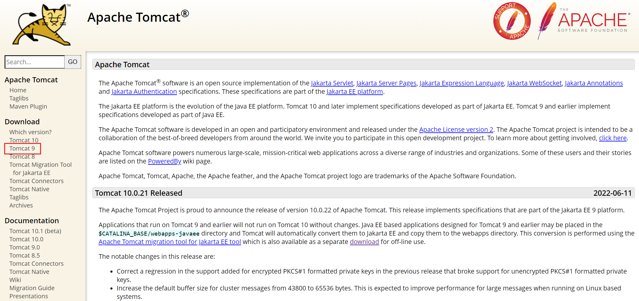 左侧栏有 Download标签,显示了多个版本,比如,以下载Tomcat9为例,点击Tomcat9