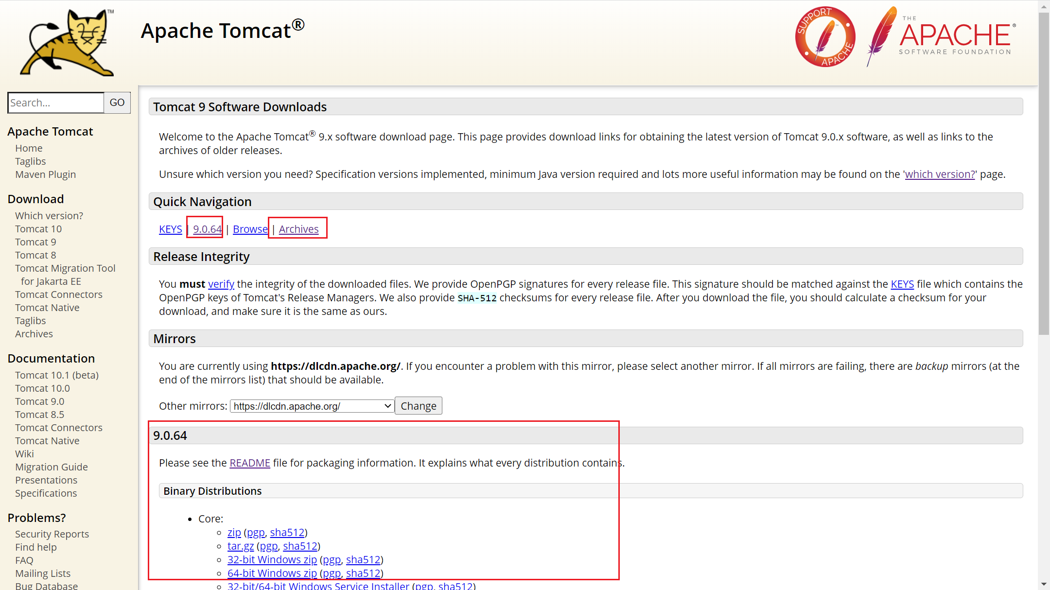 点击后,即进入9.x版本的下载页面。默认显示的9.0.64是当前最新的版本,点击这个标签,可以直接到快速下载的位置进行下载。