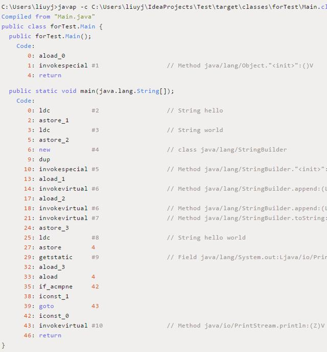 从反汇编代码中可以看到, 当用String类拼接字符串时, 每次都会生成一个StringBuilder对象, 然后调用两次append()方法把字符串拼接好, 最后通过StringBuilder的toString()方法new出一个新的字符串对象。