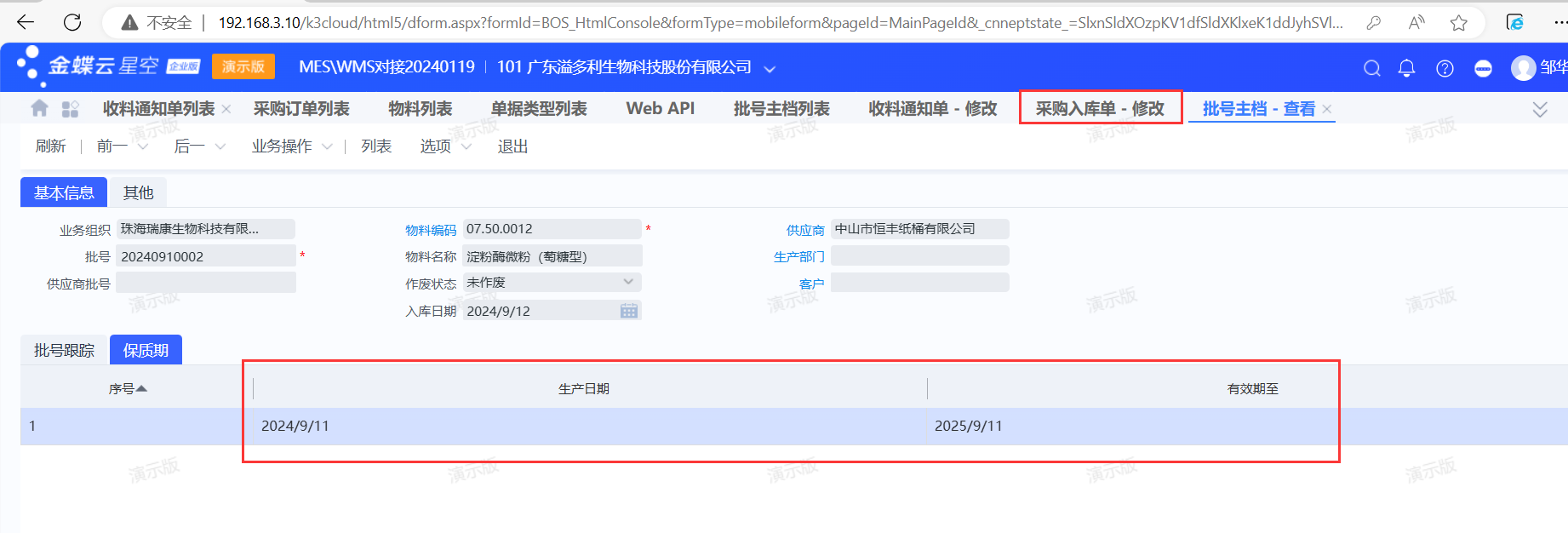批号主档中的生产日期和有效期在采购入库单审核以后才会有值