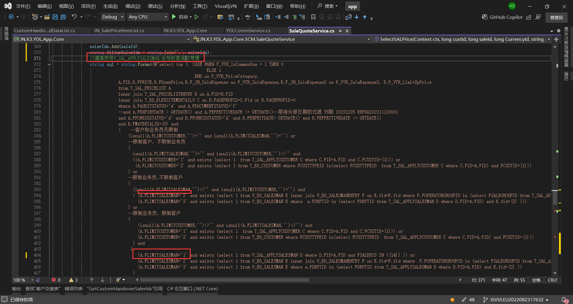 因为在“限制业务员,不限制客户”逻辑查询了V_SAL_APPLYSALESMAN,会导致查询非常慢系统卡死,且价目表中基本没有这样的数据,所以没有处理。 如果一定要查询可以用T_SAL_APPLYSALESMAN代替。