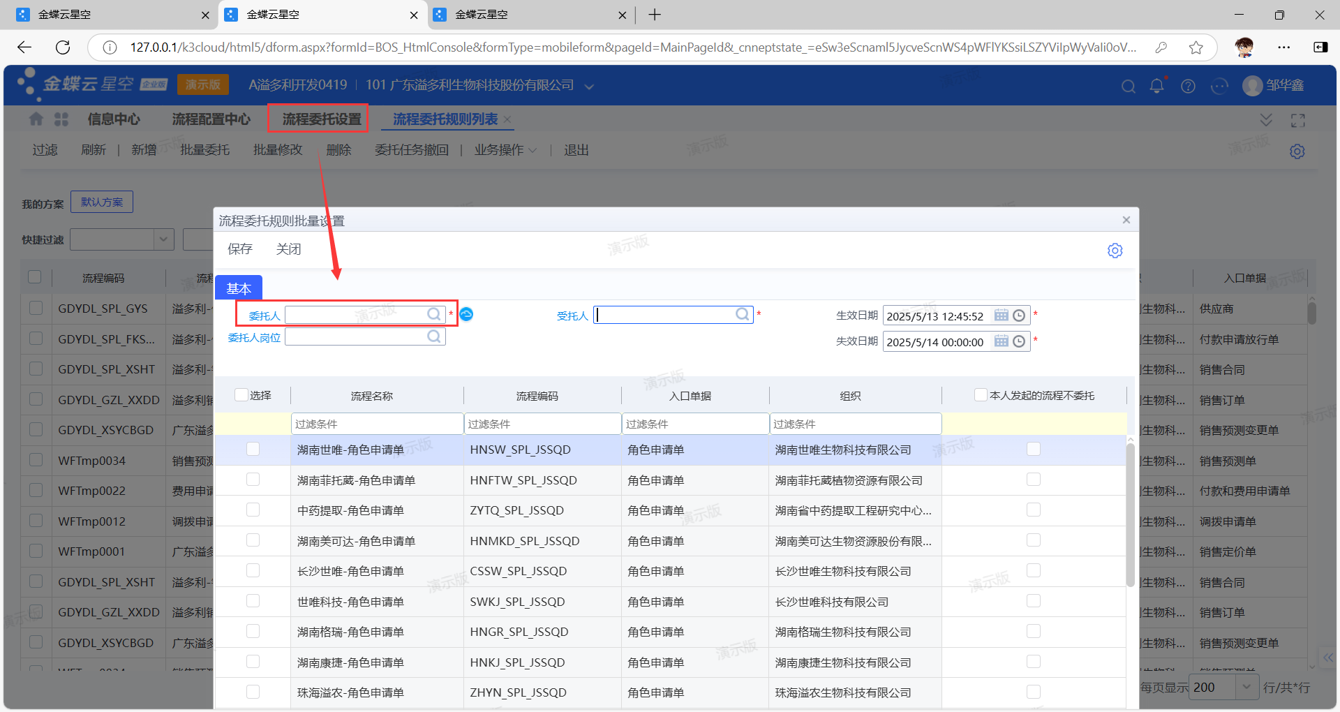 流程配置中心-委托设置-委托规则-批量委托中的委托人不会锁定当前用户, 可指定任何人.