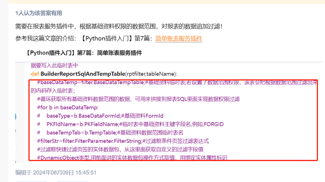 //销售员权限 var list = filter.BaseDataTempTable.Where(p => p.BaseDataFormId == "BD_Saler").ToArray(); if (list.Length > 0) { string tempTableName = list[0].TempTable; string sql = string.Format("select count(1) from " + tempTableName); DynamicObjectCollection rows = DBUtils.ExecuteDynamicObject(this.Context, sql); if (rows.Count > 0) { long count = Convert.ToInt64(rows[0][0]); if (count > 0) { filterString.AppendLine(" and BusinesserID in (select fid from " + tempTableName + ")"); } } }