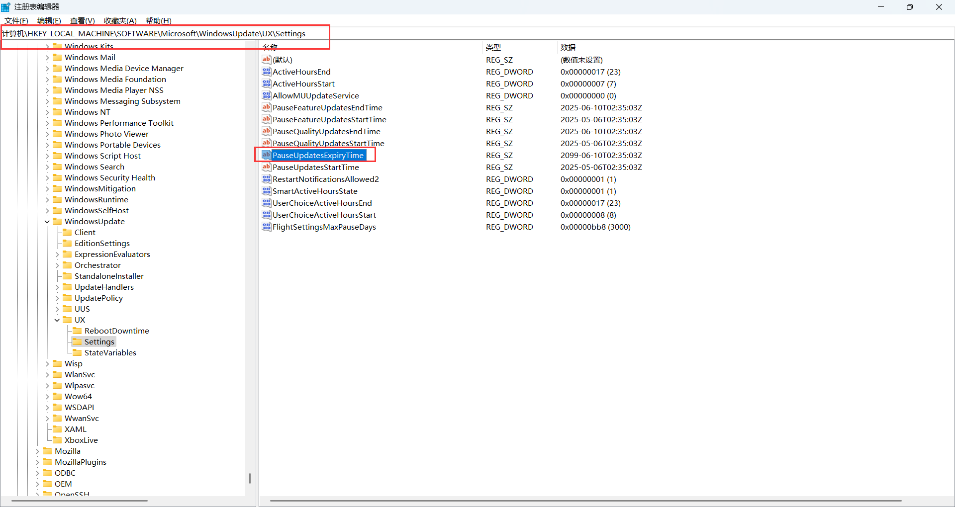 计算机\HKEY_LOCAL_MACHINE\SOFTWARE\Microsoft\WindowsUpdate\UX\Settings