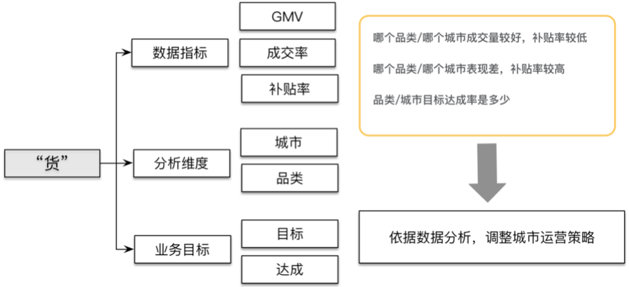 从“货”的视角,我们比较关心的就是成交了多少,交易额多少,花了多少,到具体数据指标主要会看GMV、成交率、取消率指标,在进一步会细分到城市、区域,一级品类、二级品类。数据的效果通过目标对比,横向对比、历史比较等方式进行分析确定。
