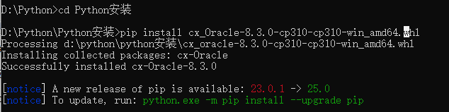打开命令提示符(CMD),指定到存放上述oracle版本的位置,运行命令安装:pip install cx_Oracle-8.3.0-cp310-cp310-win_amd64.whl