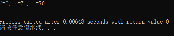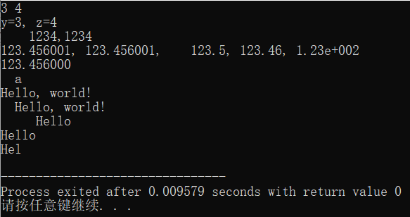 分析:“%d"仍输出整形;“”内有什么其他字符,均按照原样输出;当“%_d”空格处有整数时,表示宽度的要求,不足就补上空格,超过就按原样输出,小数也属于宽度范畴内;当小数要求取完,按这个新的数来按照宽度要求进行输出,缺位仍补上空格;“.2"等价于“0.2”;无论何时指数占五位;无论是“f"还是“lf"输出都是六位小数;在字符串”%_s"q中整数仍然是宽度要求,而小数则变成了规定有多少字符。