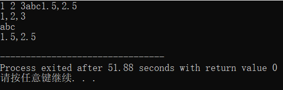 #include <stdio.h> int main() { double x,y; char c1,c2,c3; int a1,a2,a3; scanf("%d%d%d",&a1,&a2,&a3); printf("%d,%d,%d\n",a1,a2,a3); scanf("%c%c%c",&c1,&c2,&c3); printf("%c%c%c\n",c1,c2,c3); scanf("%lf,%lf",&x,&y); printf("%.1lf,%.1lf\n",x,y); return 0; }