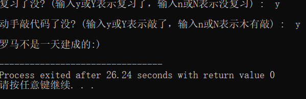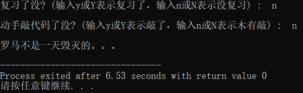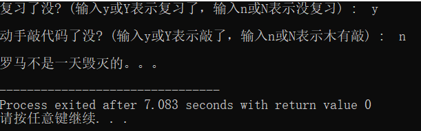 #include <stdio.h> int main() { char ans1, ans2; printf("复习了没? (输入y或Y表示复习了,输入n或N表示没复习) : "); ans1 = getchar(); // 从键盘输入一个字符,赋值给ans1 getchar(); // 思考这里为什么要加这一行 printf("\n动手敲代码了没? (输入y或Y表示敲了,输入n或N表示木有敲) : "); ans2 = getchar(); if((ans1=='y'||ans1=='Y')&&(ans2=='y'||ans2=='Y')) printf("\n罗马不是一天建成的:)\n"); else printf("\n罗马不是一天毁灭的。。。\n"); return 0; }